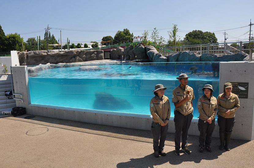 ペンギンプールのアクリル板の前で説明する飼育員ら