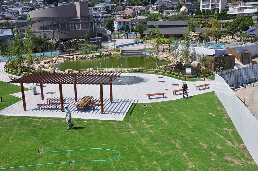 完成した噴水広場とペンギンプール(右奥)