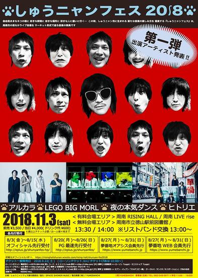 複数の会場を回って音楽を楽しむ「ライブサーキット」形式のイベント“しゅうニャンフェス2018”が11月3日午後2時から周南市の周南RISING HALL(ライ...