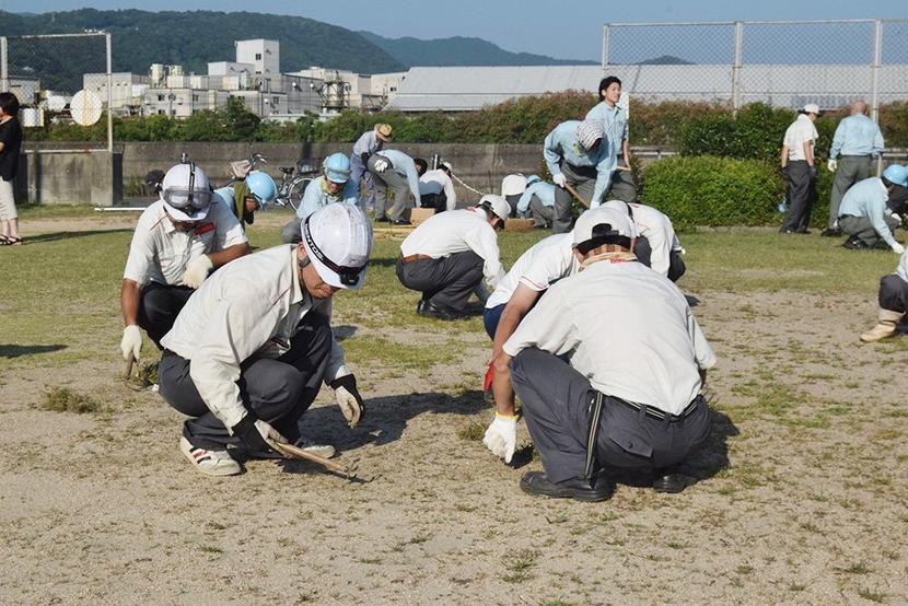 周南市三笹町のみささ公園を2日夕、近くの㈱トクヤマや日新製鋼、クアーズテック徳山、グローバルウェーハズ・ジャパン徳山工場の社員100人が訪れ、地域貢献活動とし...