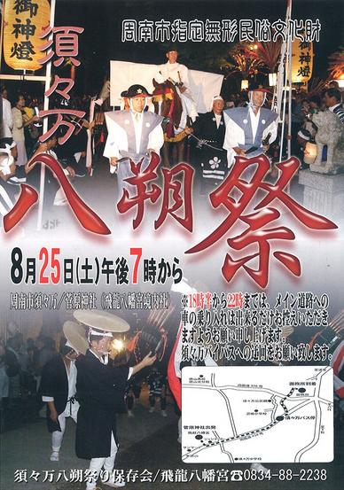 周南市須々万の飛龍八幡宮(高階正宮司)で25日午後7時から須々万八朔祭りが開かれ、菅原道真公ゆかりの大名行列や子どもを乗せた山車の揉山、若者による裸坊の網代み...
