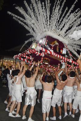 周南市須々万の飛龍八幡宮(高階正宮司)で25日夕、須々万八朔祭が開かれ、大行司、小行司を中心にした大名行列が練り歩き、揉み山、最後は網代みこしも登場して須々万...