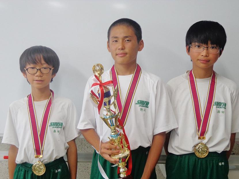 賞状、トロフィーを持つ見事、優勝した左から森田、野村、海田君