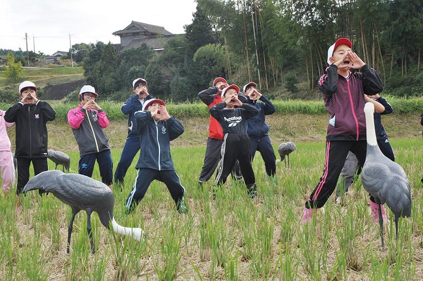 デコイを前に「ツルよ来ーい」と呼ぶ児童