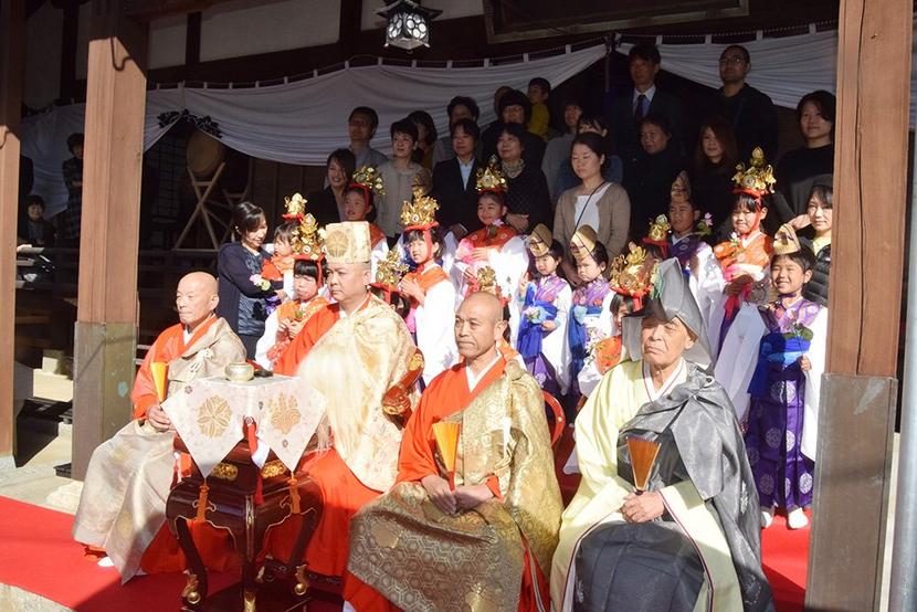 新住職(前列中央)と稚児さんらの記念撮影