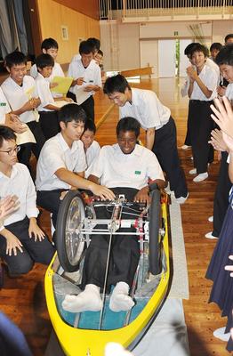 [南陽工高]リッター1,300キロの低燃費車紹介 生徒が富田中で授業
