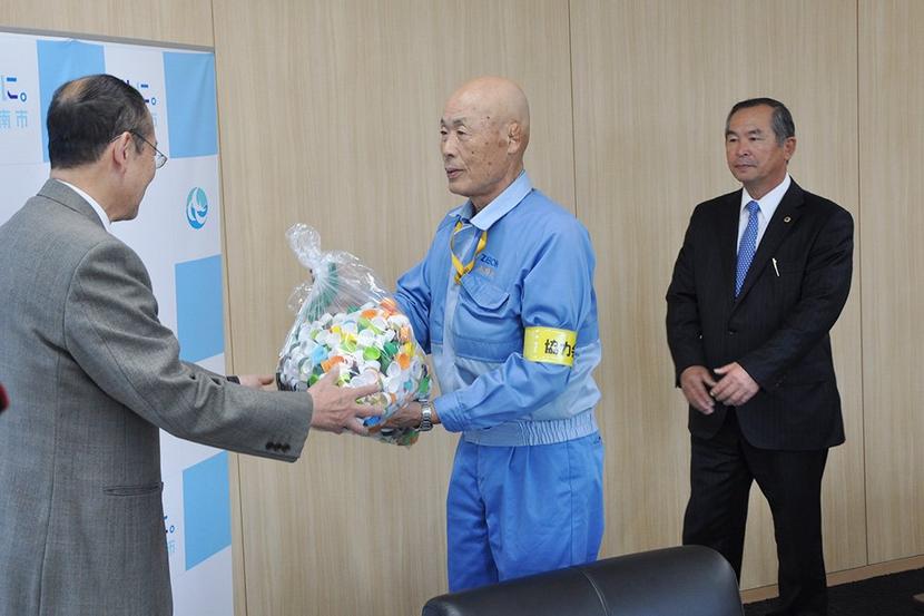 周南市那智町の日本ゼオン徳山工場協力会(22社)は2カ月間の同工場の定期検査でペットボトルのふた2万6,000個を集め、27日、山崎忠行事務局長(70)が市役...