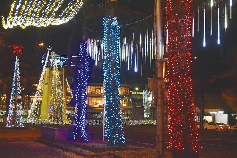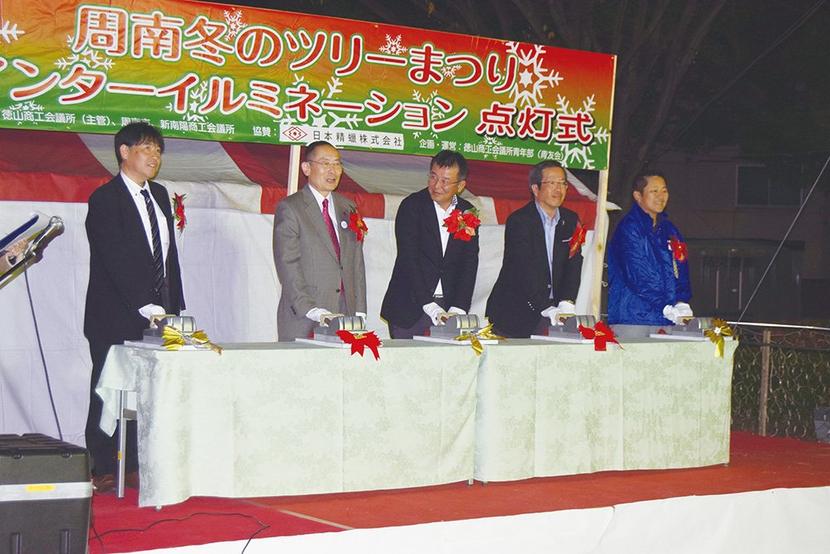 周南市の冬を彩る“周南冬のツリーまつり2018〜ウインターイルミネーション”の点灯式が1日、青空公園で開かれ、午後5時半に木村市長らがスイッチを入れると90万...