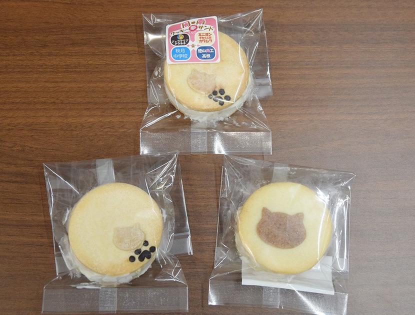 周南市の秋月中の生徒が発案して徳山商工高の生徒が秋月のミニヨン手作り工房カワムラと銀座のジェラテリアクラキチの協力で商品化した「周南クッキー夢サンド」の完成を...