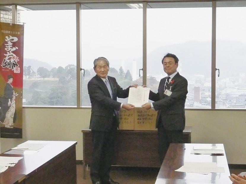 要望書を渡す有馬さん(左)