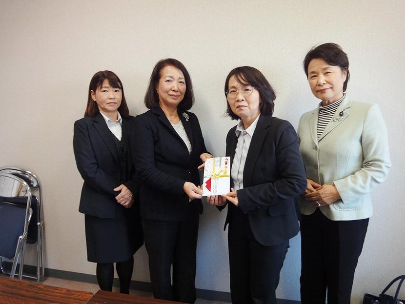 安村園長(右から2人目)に寄付金を渡す箱崎支部長(同3人目)