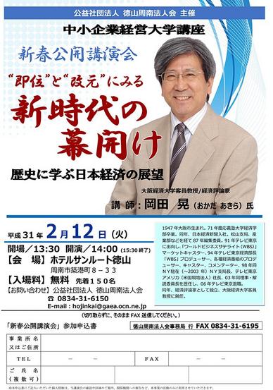 経済評論家、岡田晃さんを講師に迎えて、徳山周南法人会(有田建二会長)の中小企業経営大学講座新春公開講演会が2月12日午後2時から周南市築港町のホテル・サンルー...