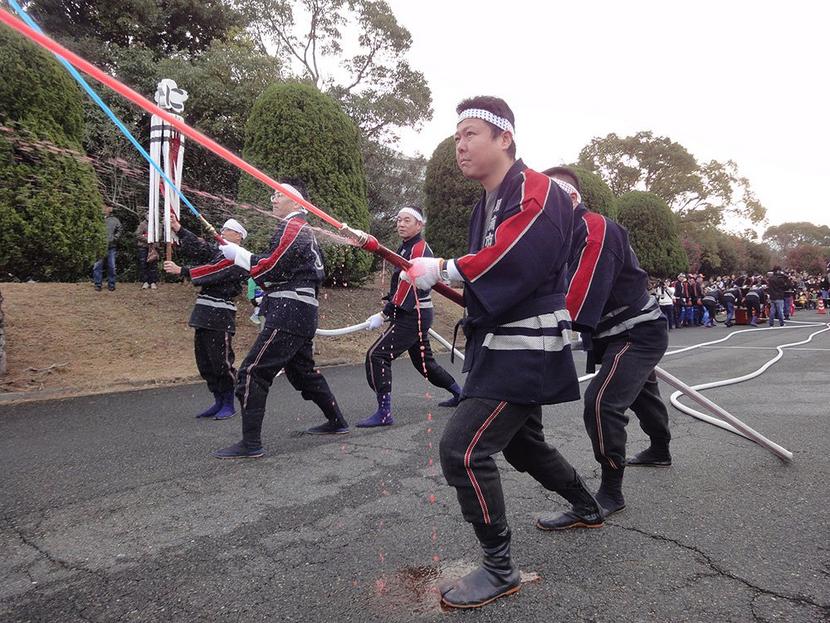 一斉放水する消防団員