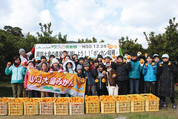 周南地域の子どもたちが12月28日、大島大橋の送水管破断事故の影響で遅れているかんきつ類の収穫を応援しようと周防大島町を訪れ、ポンカン500キログラムを摘み取...