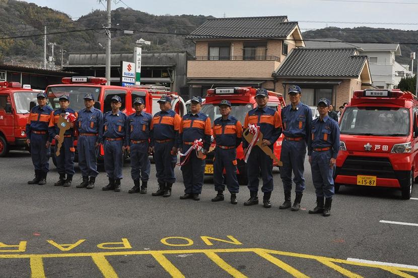 周南市の消防団車両配備式が15日、市消防本部で開かれ、熊毛地区の市消防団東第3分団(伊藤正行分団長)の呼坂機庫に小型消防車の普通積載車、大津島の中央第15分団...