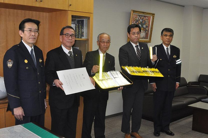 周南市の徳山ライオンズクラブは12日、周南署に反射リストバンド千本と反射たすき244本を贈った。交通安全キャンペーンや交通安全教室などで配る。 同クラブの矢...