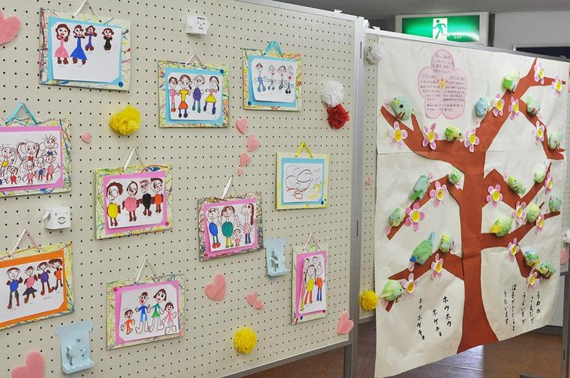 周南市の菊川保育園の園児の作品展が政所の東山口信用金庫富田支店(清水健治支店長)のロビーで開かれ、家族を描いた絵や、花が咲き、ウグイスが集まる梅の木を描いた共...
