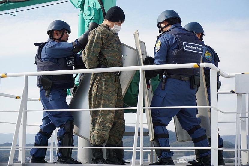 船上でテロリスト役の男性を取り押さえる海上保安部員