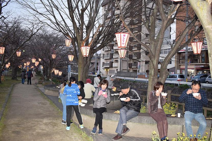 山口県周南市の中心市街地を流れる東川沿いの緑地公園で23日夕、ぼんぼり点灯式が開かれた。この日から4月13日まで250個のぼんぼりが点灯する。6日午前10時半...