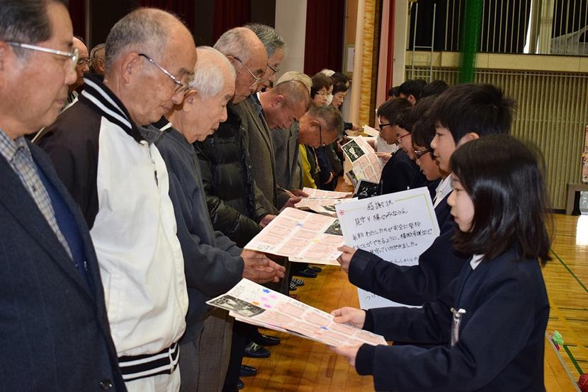 カレンダーを渡す児童