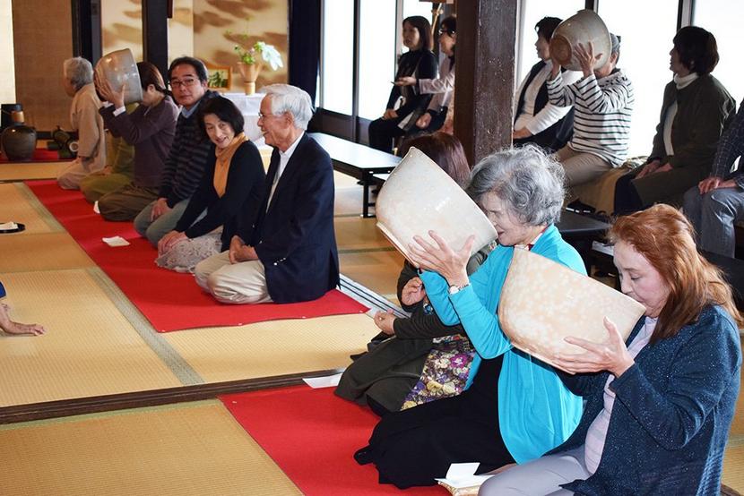 大茶わんで抹茶を飲む参加者