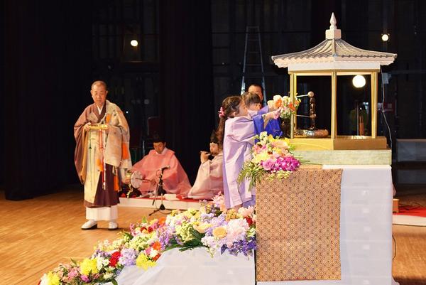 【周南市】舞台の花御堂に手合わせ 周南市仏教団花まつり