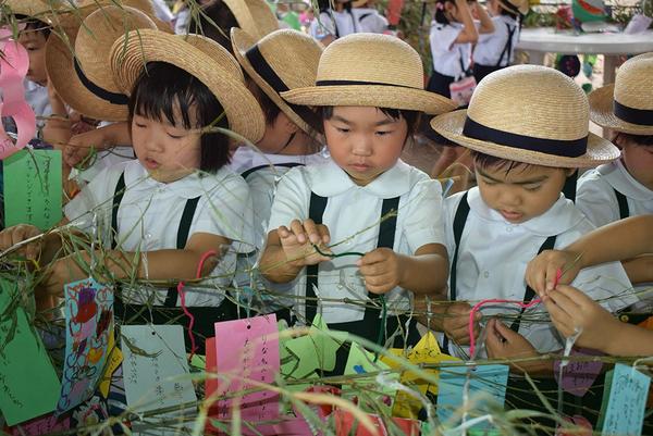 周南市の徳山動物園は26日、中央ステージで「七夕の飾りつけ会」を開き、河原幼稚園(金子清学園長、335人)の園児や保護者が願いごとを書いた短冊を中央ステージの...