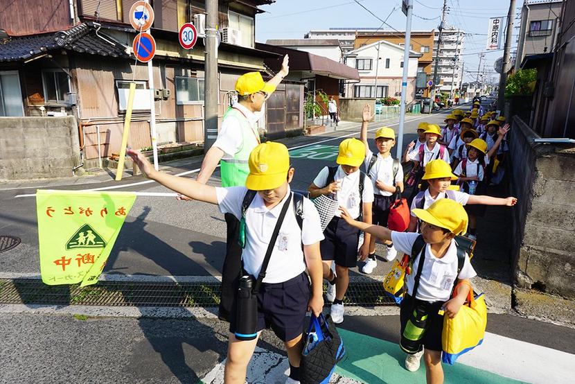 河村校長の安全指導を受けて集団登校する児童(3日、遠石小)