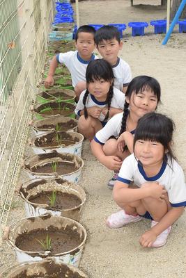 バケツ稲の植え付け 大河内幼園児が体験