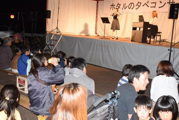 周南市鹿野の豊鹿里パークで8日夕、ほたるの夕べコンサートが開かれ、ホタルが乱舞する渋川のそばでピアノ、バイオリンやハープなどの演奏を3千人が楽しんだ。 か...