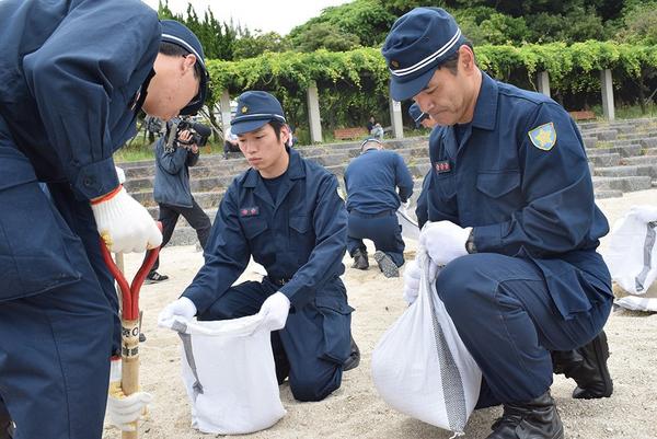 周南、下松、光署合同の災害警備訓練が4日、周南市の長田海浜公園で開かれ、35人の警察官が土のう壁構築やチェンソーの使用、ゴムボートを使った水難救助の訓練に取り...