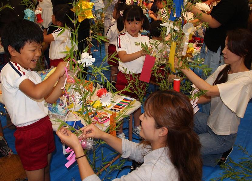 七夕飾りを一緒に作る親子
