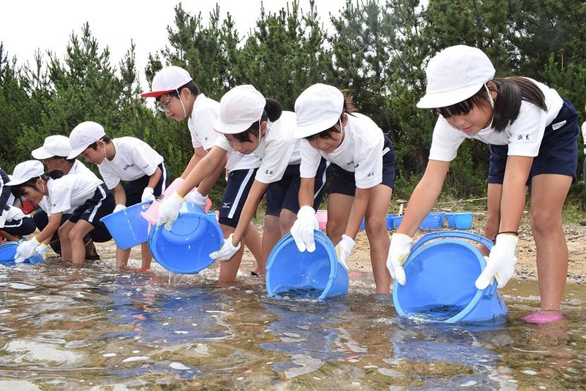 トラフグの稚魚2千500匹 鼓南小児童が放流
