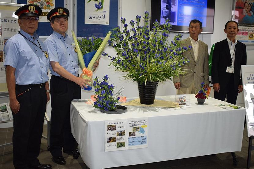 展示されているリンドウと池田駅長(左から2人目)、森弘さん(3人目)