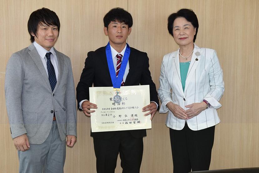 徳山大学レスリング部の3年、小野弘運(ひろかず)選手(20)が明治杯全日本選抜選手権大会のグレコローマンスタイル55キロ級で2位に入り、12日、市役所で藤井市...
