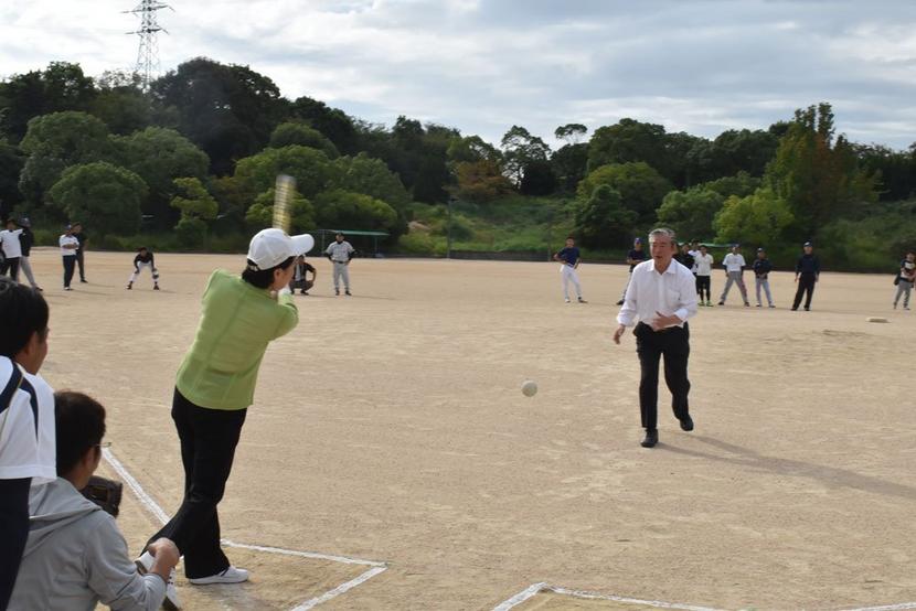 始球式の藤井市長と中馬教育長