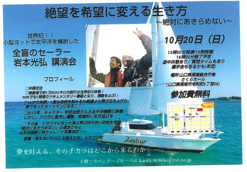 小型ヨットで太平洋を横断した全盲のセーラー、岩本光弘さんの講演会「絶望を希望に変える生き方~絶対にあきらめない」が20日(日)午後1時半から周南市毛利町の県周...