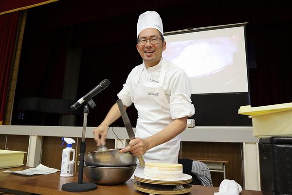 周南市の久米小(石田勝己校長)で18日、市内で活躍している卒業生を招く講演会が体育館で開かれ、櫛ケ浜でレッヒェルン洋菓子店を営む西野竜三さん(38)が「レッヒ...
