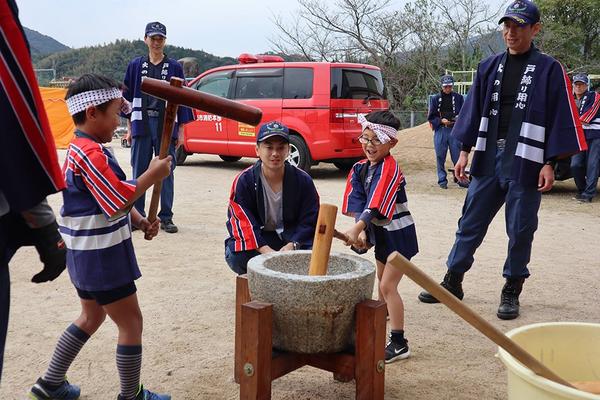 周南市戸田の桜田幼稚園(深井淑恵園長)で7日、防火餅つき大会が開かれ、秋空の下、園児44人と保護者や戸田婦人防火クラブなど大人40人で盛り上がった。 秋季...