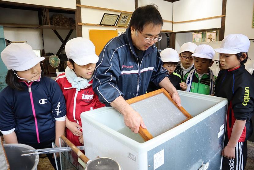 周南市の須金和紙センターで13日、須磨小(坂井竹俊校長)の6年生4人が来年春の卒業式に向けて卒業証書用の和紙すきをした。1年から5年の10人も和紙絵用の紙をす...