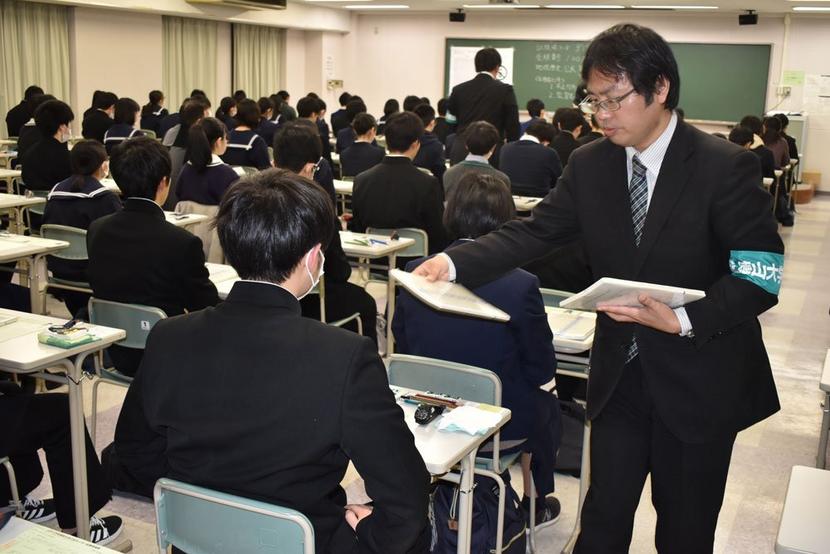 両日とも雨も降る曇だったが混乱はなく、試験前には大学の玄関前で徳山高、光高、下松高の名前が入った横断幕を掲げる姿もあった。試験場は同大学の教室で、最後までノートや参考書に向かっていたが、同大学の教員などの試験官の指示でバッグに入れ、静かに説明に聞き入り、志望校目指して一斉に回答用紙、問題用紙に向かった。