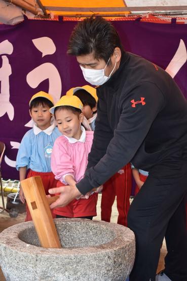園児たちはもちをつく間、「よいしょ、よいしょ」と大きな掛け声で応援し、園児も大人に手伝ってもらいながら餅に向かってきねを振り降ろした。餅を丸めることも体験し、まだ温かい餅をにぎって楽しそうだった。