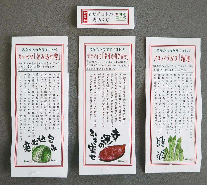 もっと野菜に親しんでもらおうと「野菜は食べるお守り」をコンセプトに開発したおみくじは、印刷と制作を周南市の福祉サービス事業所「望みの家」が手掛け、キャベツ=包み込む愛▽サツマイモ=幸運の引き寄せ▽アスパラガス=躍進などの「ヤサイコトバ」と可愛らしいイラストが描かれている。