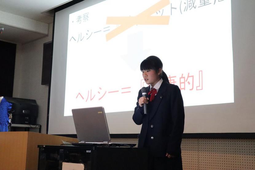 3年生は会場に集まった同科1年生30人と2年生23人の前で、2分30秒の持ち時間のなかスライドで、「服装や色がもたらす外見の効果」や「鉄分の吸収を良くするスムージー」など各自が選んだ様々なテーマについて、研究のきっかけ、内容、まとめを手際よく要約して発表した。