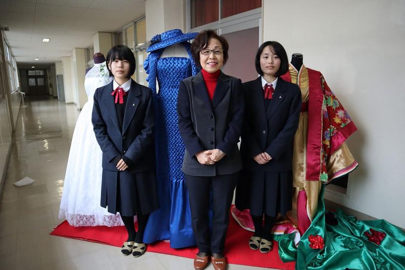 相川朋果さん(18)が作った白いウエディングドレスと嶋村充穂子さん(18)が作った十二単(ひとえ)が、全国高校家庭クラブ連盟クリエイティブコンテストで学校賞を受賞したことも報告。指導にあたった岩国市・日本洋装協会理事の井上栄子さん(68)の東京都知事賞受賞の青いドレスと一緒にそれぞれ会場出口に展示した。