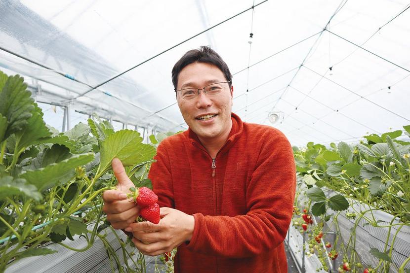 体験型メニューにはイチゴ狩りも用意され、広々とした温室ハウスのなかにはイチゴの苗2800株が可愛らしい実をつけている。「よつぼし」という品種のイチゴは、大ぶりで甘く、食べた時に香りが鼻にぬける。