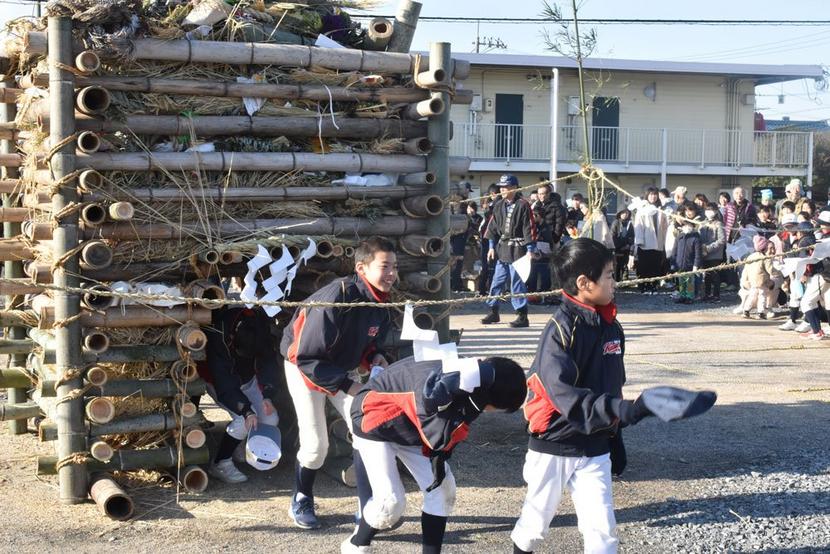同地区コミュニティ推進協議会(山根昭昶会長)の主催。どんど焼きでは広場の真ん中に竹を組んで作った大きなやぐらにしめ飾りや御札、しめ縄などが詰め込まれ、トンネルもあって子どもたちなど参加者がくぐった。