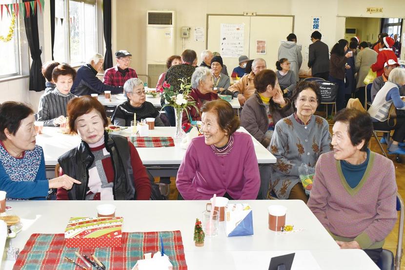 今宿市民センターの講堂。昨年12月23日に33回目となる今宿カフェが開かれた。高齢者が気軽に集まれる場をと3月に始まって毎週月曜に開かれてきた。この日はクリスマス会でいつもより参加者が多く、スタッフを含めて70人が集まった。