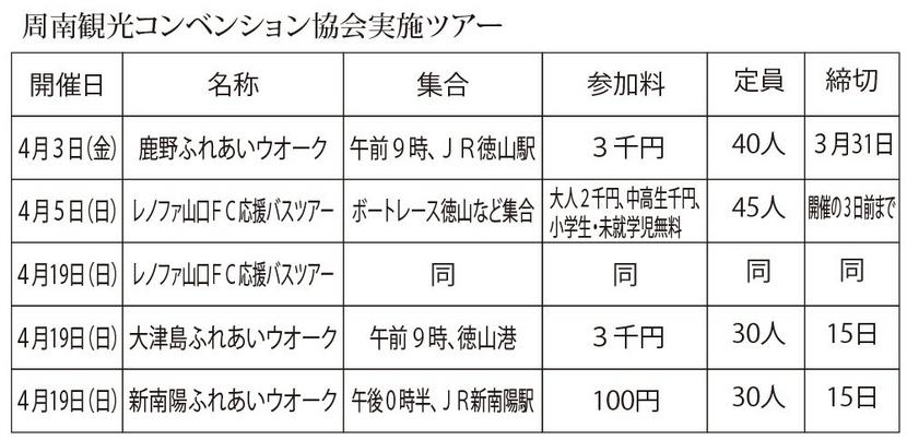 周南市の周南観光コンベンション協会は3月後半からのレノファ山口FC応援バスツアー、市内を歩くふれあいウオークの一部を中止すると発表した。 中止は22日の応...
