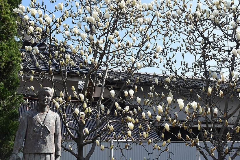 春を告げる花の一つ、ハクモクレンが街のあちこちで咲いている。周南市毛利町の県周南総合庁舎の旧徳山高等女学校跡の記念碑そばのハクモクレンも白い大きな花が木を包む...